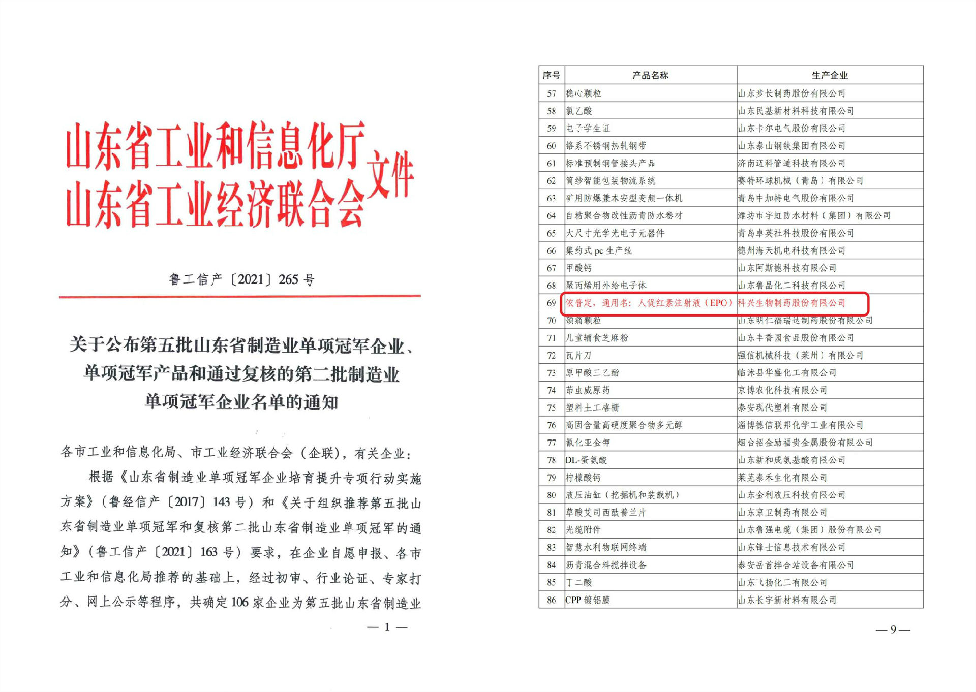 Recently, according to the List of the Fifth Batch of Champion Enterprises and Champion Products in Manufacturing Industry of Shandong Province published by the Department of Industry and Information Technology of Shandong Province, Human Erythropoietin (EPOSINO) was identified as the Champion Product of the Manufacturing Industry in Shandong Province. This award is given to a company that has a leading position in production technology and the production process, attaches importance to R&D investment, and has independent intellectual property rights and high-quality products, with key performance indicators exceeding those of similar companies in China. The winner must also have a market share among the top 5 in China and the biggest market share within its province.