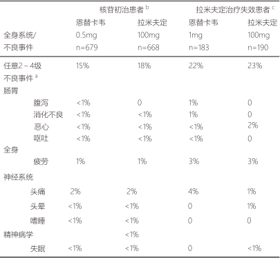 96周期間,ETV組和ADV組治療相關(guān)的2-4級(jí)AEs發(fā)生率相似(分別是13%和16%)。