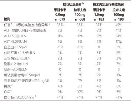 表3∶四項(xiàng)恩替卡韋臨床試驗(yàn)中,2年治療期間危急實(shí)驗(yàn)室檢查異常